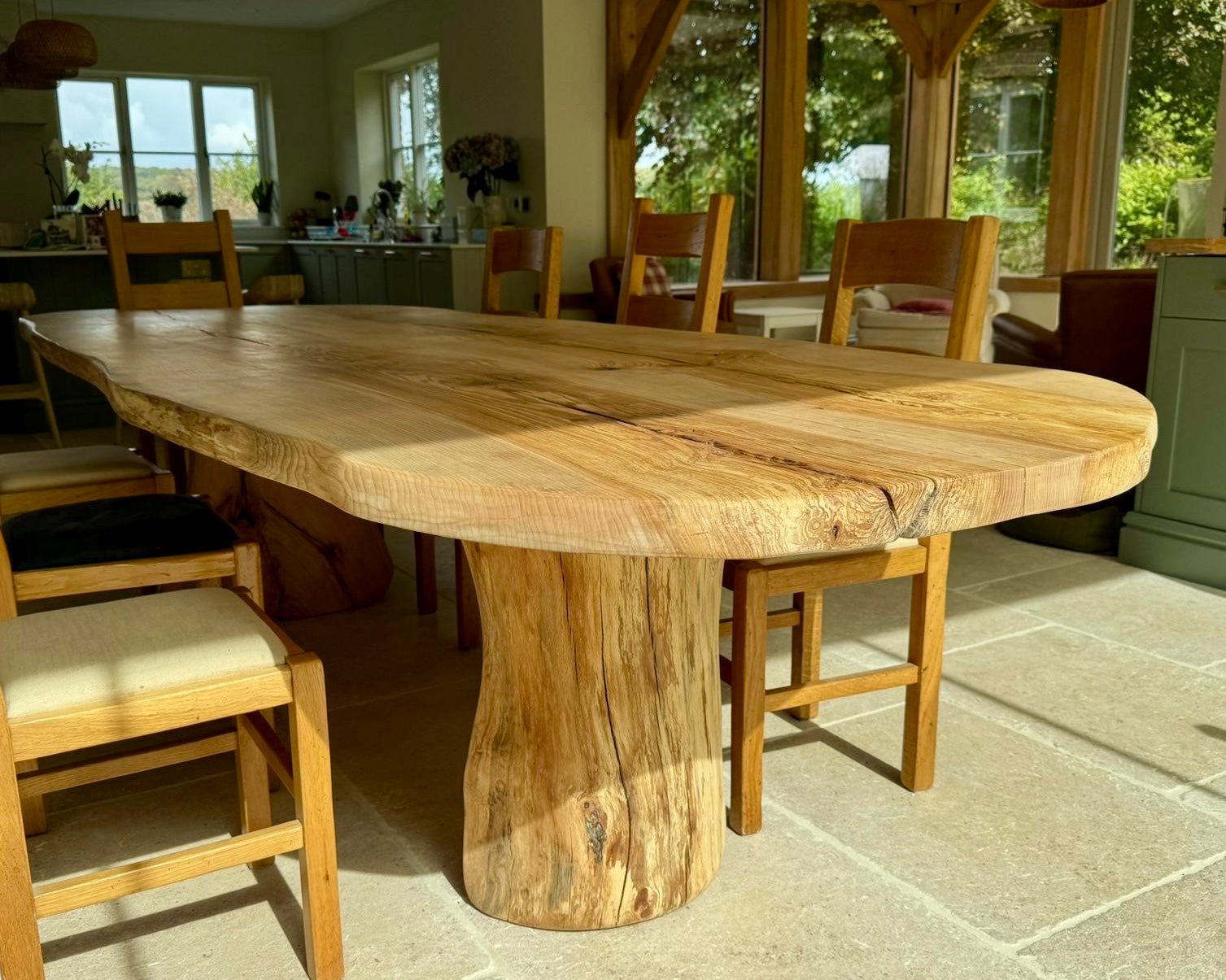 This ash dining table was made from our clients fallen ash tree. We kept the live edge and enhanced it to suit the clients needs. The legs are made from solid red oak trunks to couple the ash in tone and texture, sculpted into shape to make them a true statement piece.
