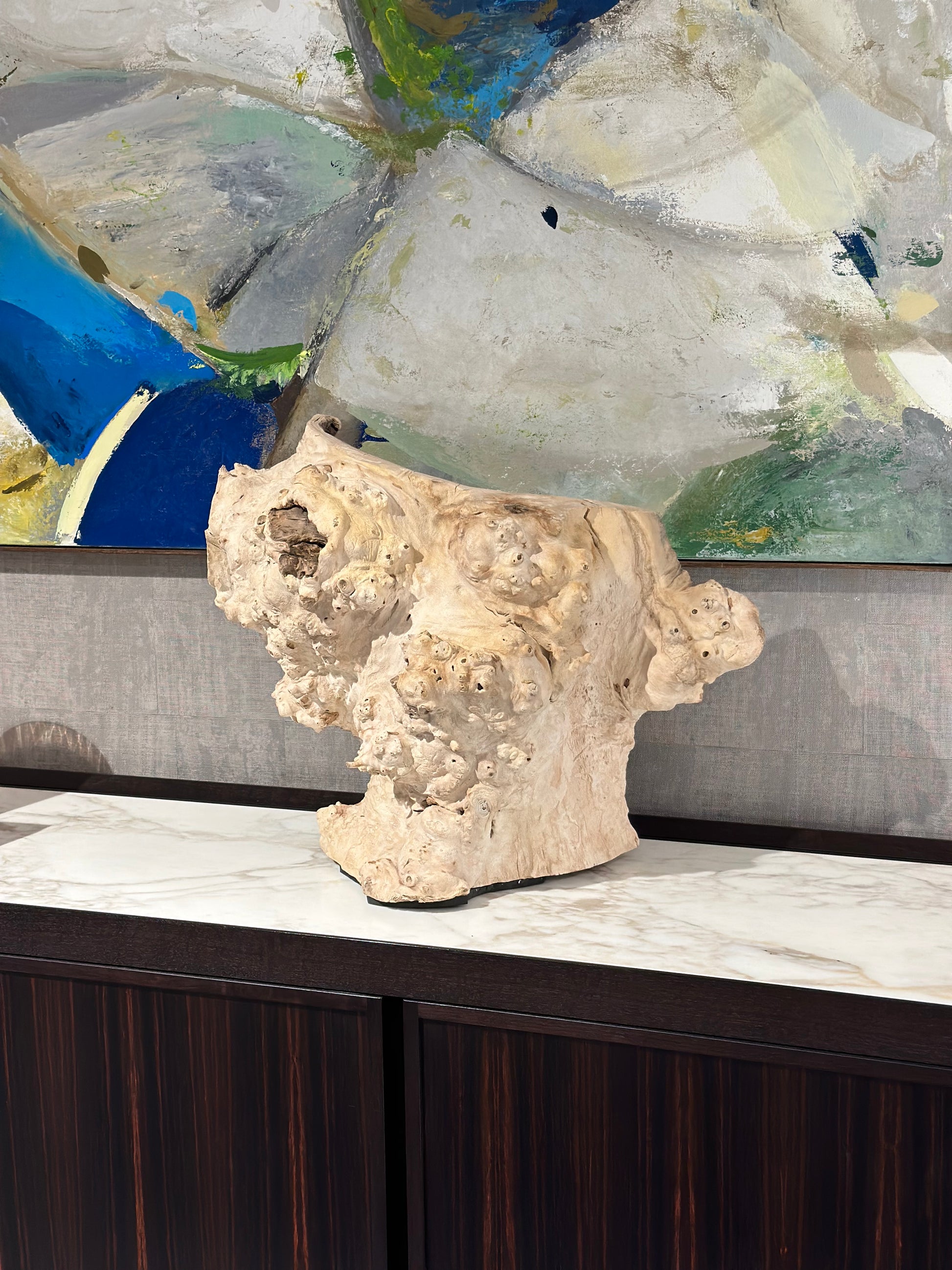 Created from a bur wood, crafted with numerous techniques including sand blasting to create the rock like textures.